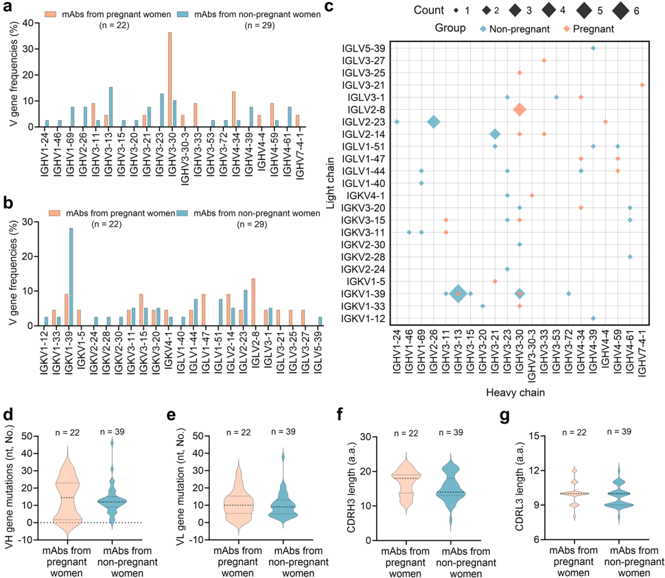 本研究针对妊娠期免疫应答特性,系统评估了灭活COVID-19疫苗在孕妇群体中诱导的体液免疫应答特征。通过单细胞抗体克隆技术,发现孕妇虽能产生与非妊娠妇女相当的血清抗体水平,但其记忆B细胞产生的抗体在结合活性、中和广度及胚系基因多样性方面均显着减弱,揭示了妊娠状态对疫苗诱导的免疫记忆质量的潜在影响,为特殊人群疫苗接种策略提供了重要理论依据。